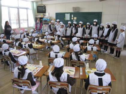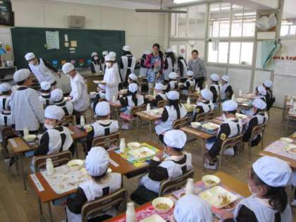 給食が始まって2日目。1年生の給食は、6年生のお兄さんお姉さんが、手伝いに入っています。さすが6年生です。手際よく配膳ができていました。1年生も、準備をしてもらっている間、お行儀よく待つことができていました。
