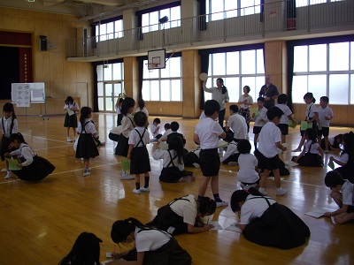 今日は1年生2年生の英語活動の日です。教室や講堂を使って楽しく学習しました。本校では、1年生から6年生まで英語の学習を進めています。