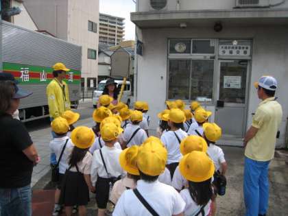 1年生が生活科の学習で自分たちの住んでいる校区について調べに行きました。交番や公園など知らない場所の様子や橋や川の名前などたくさんの発見がありました。今回は城東区役所のJ−TAT(安全パトロール隊)のみなさんにもご協力いただきました。