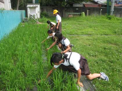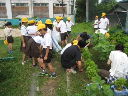 毎月、運動場や中庭の草引きをしています。今日も児童朝会のあと力を合わせて管引きをしました。