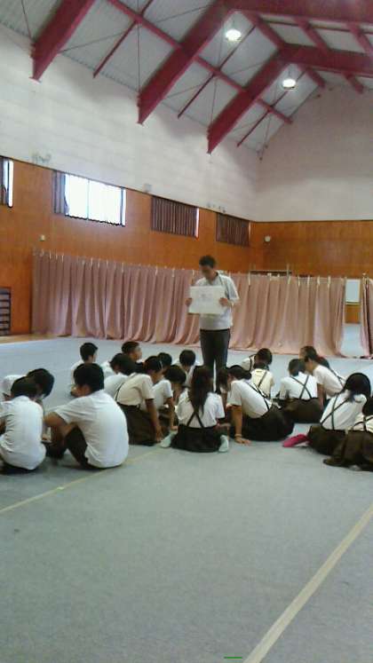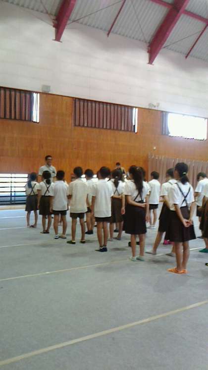 急に雨が降り出したので、宿舎の体育館を使って開舎式をしました。開舎式に続いて、ハチ高原の宿舎での過ごし方、並びに、避難訓練の説明を聞いています。