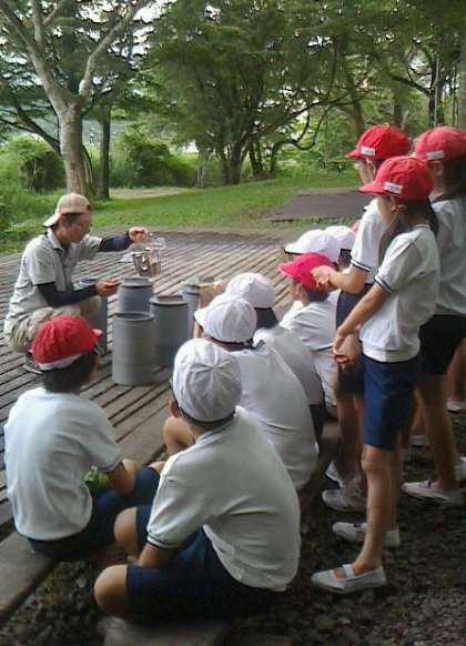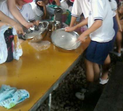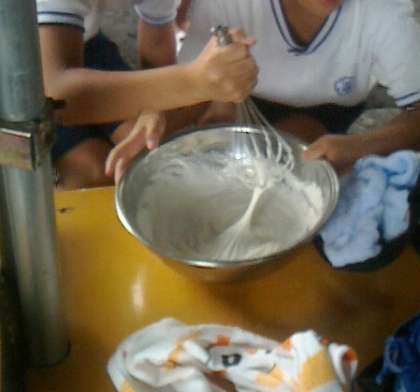 作り方の説明を聞いて、いざ、ホイップの泡立てに取り掛かりました。ホイップを泡立てるのが、一苦労です。友だち同士、協力して作っています。