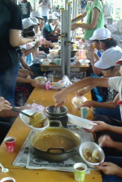 みんなでカレーを盛り付けて、さあ、いただきます。自分たちで作ったカレーですから大満足。おいしそうです。