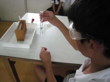 6年生は水溶液の性質につて学習しています。今日は塩酸の性質について実験をして確かめていました。