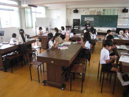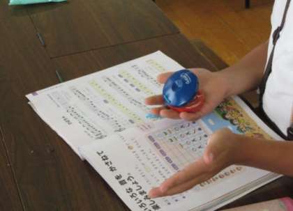 2年生は音楽の授業で、トライアングルやカスタネット、すずなどの楽器を伴奏に合わせて上手に演奏していました。