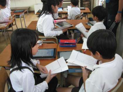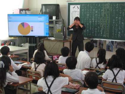 3年生の国語の学習は、「もうどう犬の訓練」という説明文の教材を使って学習をしています。文章の大事な言葉や文を引用しながらリーフレットをつくります。今回はタブレット端末を使って文作りもしてみました。