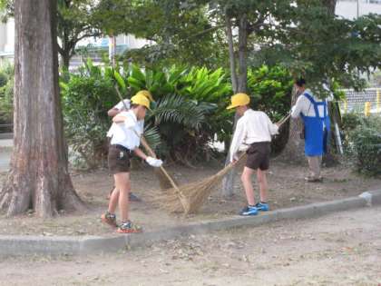 校区内の公園を清掃する「地域ふれあい清掃」に4年生が参加しました。地域の女性部の皆さんや保護者の皆さんと一緒に公園を掃除しました。
