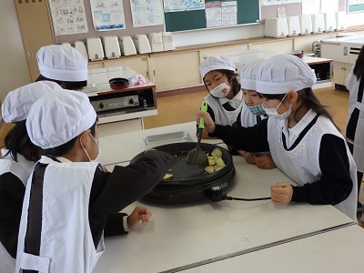 2年生が生活科で育て収穫したさつまいもで収穫のお祝いに、「おいもパーティー」をしました。そして、調理したおいもを1年生にプレゼントしました。1年生も喜んでいました。