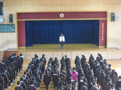 3学期が始まりました。始業式を全学年がそろって行いました。校長先生のお話、生活指導の先生からのお話のあと、全員で校歌を歌いました。