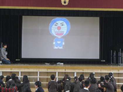 今回は「誰が描いた絵でしょう」です。スクリーンに映された絵を見て、縦割り班ごとにどの先生が描いた絵なのかを答えます。先生の特長をよくとらえている子どもたちは、すぐに分かったようです。