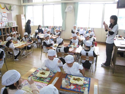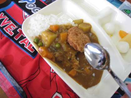 1年生にとっては初めての給食です。今日の献立はカツカレーライス、フルーツ白玉、ミニフィッシュ、牛乳で入学お祝い献立でした。カレーには給食調理員が型抜きをした星形の人参も入っていて、食べるのがとても楽しそうでした。