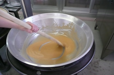 今日は、ビーフシチューに入る人参を切り方を工夫して「ラッキー人参」として入れる準備をしています。何人の児童にラッキー人参が入っていたでしょうか。ビーフシチューのデミグラスソースも市販のものではなく、一から作っています。ずっと櫂を回し続けるのでなかなかの重労働です。出来上がりは、見本のセットをして、児童が楽しく食べられるように工夫します。おいしいビーフシチューでした。