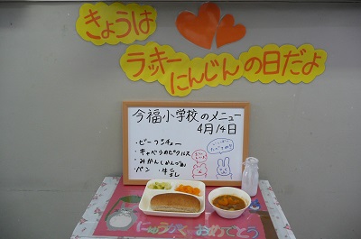 給食が始まって4日目。今日の献立はビーフシチュー・キャベツのピクルス・みかん(かんづめ)・パン・牛乳です。今回は、おいしい給食を作っている調理室を取材しました。