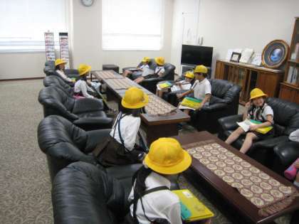 区役所見学では、たくさんの区役所の係があることに驚いていました。途中、区長室に入れていただいたり、区民ホールの中を見学させていただいたりしました。見学態度もよく、とても立派でした。