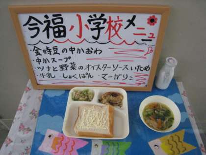 今日の給食の献立は、金時豆の中華おこわ、中華スープ、ツナと野菜のオイスターソース炒め、牛乳、パンでした。中華おこわは風味がよく、とってもおいしかったです。
