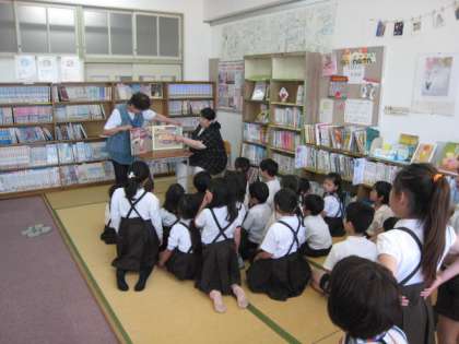 今回の図書ボランティアさんの読み聞かせは「もぐらバス」です。たくさんの子どもたちが参加しました。また、今日は図書館開放の日でもあるので、自分の読みたい本を静かに読んでいる児童もいました。