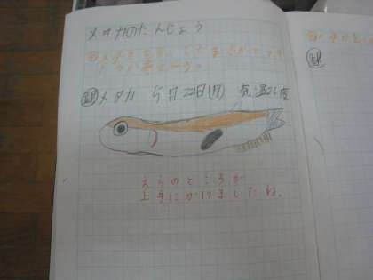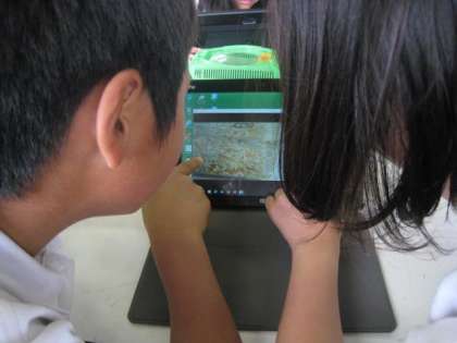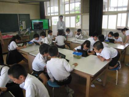 5年生は理科の時間、メダカの誕生の学習をしています。今回はタブレット端末を使って、メダカを撮影し、オス・メスの体の特長を調べます。二人で1台のタブレット端末を活用しメダカの体の特長を捉えていました。