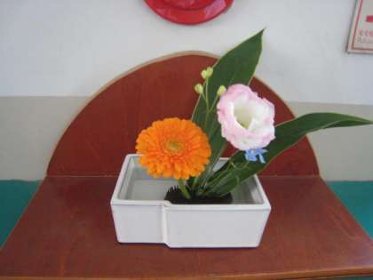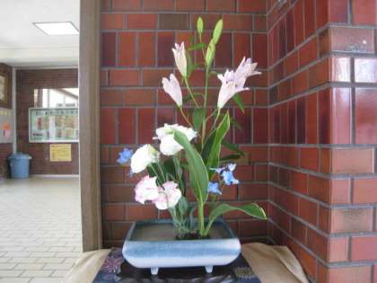 今回はユリの花がとってもきれいな生け花です。校長室の前のお花もかわいいお花を活けてくださいました。
