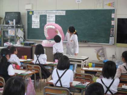 今日は3年生で歯磨き指導がありました。大きな歯の模型を見て、歯の形や、歯磨きの工夫について学習しました。