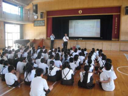 毎年、5・6年生を対象に、夏休み前に「非行防止教室」として、スマートフォンや携帯電話の使い方について、城東警察の方にご指導いただいています。今年は、4年生も含めてご指導いただきました。メールやチャット、ラインといったSNSを使うことは、短い言葉でのやり取りになり、当事者の真意が伝わらないことがよくあります。誤解を生み、いじめの原因となることもあります。思いを伝えるときは顔を見て話すことの大切さをご指導いただきました。また、少年犯罪についても触れられ、子どもたちは緊張した面持ちでお話を聞いていました。