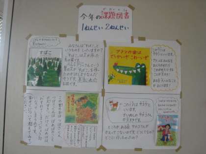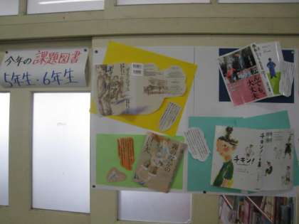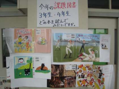 夏休みには読書感想文の宿題が出ます。そこで、児童にどの本が課題図書になっているかを知らせるために、学年ごとに掲示をしています。児童がどんな本を選び、どのような感想文を書いてくれるのか楽しみです。(上から低学年・中学年・高学年)
