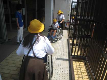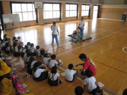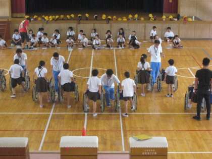 大阪市立心身障がい者リハビリテーションセンターの皆さんに来ていただき、4年生が車椅子体験をしました。少しの段差でも動かなくなる車椅子をしり、自分たちの生活を振り返ることができました。最後に、校内を車椅子で回りました。押し方乗り方について、思いやりの気持ちの大切さを感じ取ったようでした。