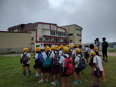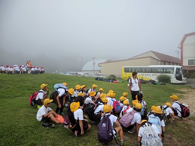 5年生一行は、12時前に宿舎に到着しました。現地は雲の中のようで、ガスがかかっています。到着して、宿舎の方とご挨拶をしました。他校の子どもたちもぞくぞくとハチ高原に到着しています。