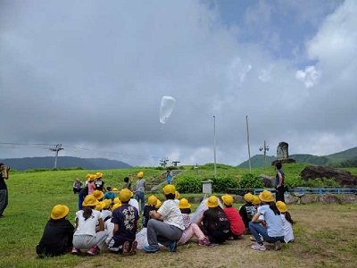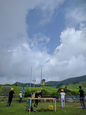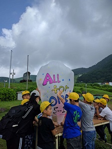 出来上がった気球を高原に持っていき、空に上げました。風も強すぎず随分高く上がりました。それぞれの気球には、子どもたちの願いが書かれているようです。