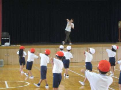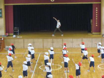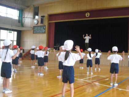 1年生2年生は運動会でリズムに合わせた演技をします。拍をとりながら先生の指導に一生懸命ついていっています。初めてとは思えないほど、よくそろっています。