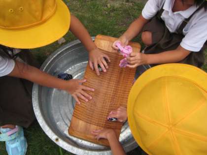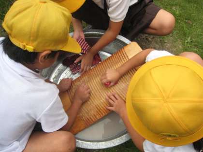 3年生は昔の生活について学習しています。今日は、洗濯板を使って靴下の洗濯をして、洗濯板のよさを見つけたり、現在の洗濯機に生かされているところを見つけたりしました。
