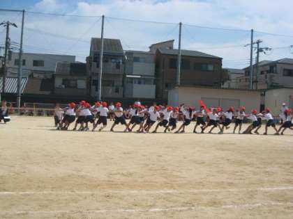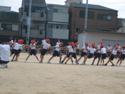 綱引きは1・2年生、3・4年生、5・6年生と2回戦ずつ行います。どの学年も大きな声を出して綱を引きました。