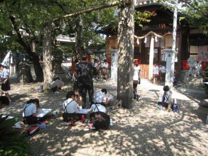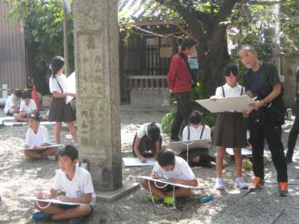 校区内にある皇大神宮に写生にいきました。毎年5年生は皇大神宮で写生会を開かせていただいています。普段と違う外での構図の取り方に子どもたちは悪戦苦闘していましたが、先生方のアドバイスで徐々にお社の特徴をとらえてかけるようになりました。完成が楽しみです。