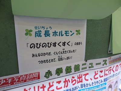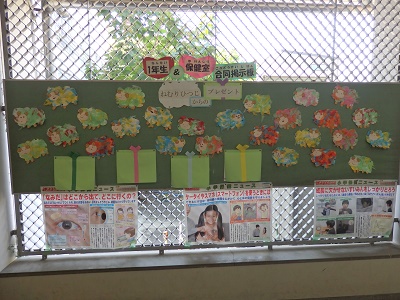 保健室前の掲示は10月10日の目の愛護デーにかけて、目を休めるために大切な睡眠についてわかりやすく掲示しています。