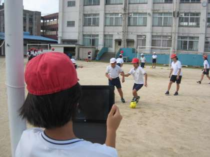 6年生はボール運動の学習でサッカーの学習をしています。本年度から、けがを減らし、ボール運動が苦手な子どもも学習しやすいように、スポンジを使ったサッカーボールを購入し使っています。また、チームごとの練習では、タブレット端末を子どもが使いながら写真や動画を撮り、自分たちのチーム練習を振り返りに活用しています。