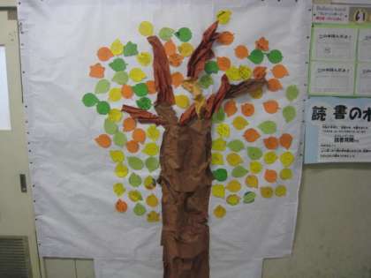 10月は本校の読書月間でした。図書委員会の児童が主体となって読書の木の活動を進めました。読んだ本中で、おすすめの本を画用紙で作られた葉っぱに書いて木に貼っていきます。たくさんのおすすめの本があったようです。読書の木が葉っぱでいっぱいになりました。