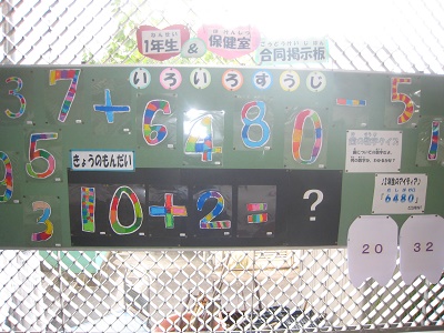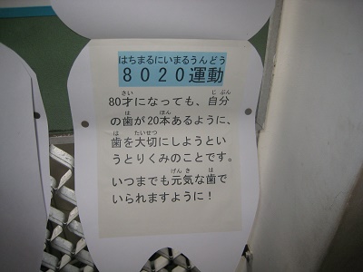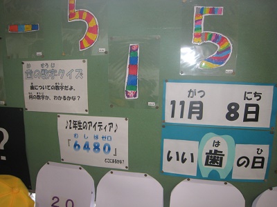 今回の掲示は、歯の健康にかかわる内容です。数字の組み合わせを使ってわかりやすく掲示しています。クイズにもなっていて、子どもたちは歯の健康について楽しく考えることができています。