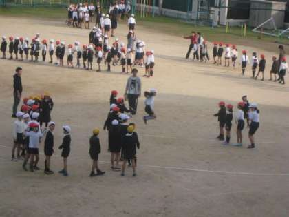 各学期に、なわとび大会を実施しています。学年ごとに長縄を使って上手に飛んでいました。低学年の部の1位は3年生、高学年の部の1位は6年生でした。子どもたちは、お互いに声を掛け合いながら頑張りました。