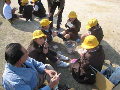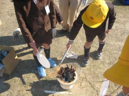 3年生は社会科で昔の暮らしについて学習しています。今回は、地域の皆様に来ていただき七輪の火起こしをしてお餅を焼きました。地域の皆様にわかりやすく火起こしの仕方を教えていただいたので、早くに炭に火が付き、お餅を焼くことができました。七輪の仕組みに興味をもち、七輪の良さについて考えることもできました。最後は教室で、地域の皆様へ昔の暮らしについて質問をさせていただきました。