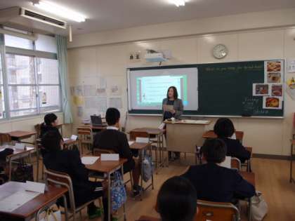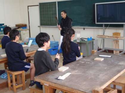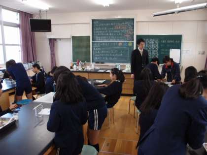 6年生が進学先中学校になる放出中学校で体験学習をさせていただきました。上の写真は授業体験をさせていただいている様子です。