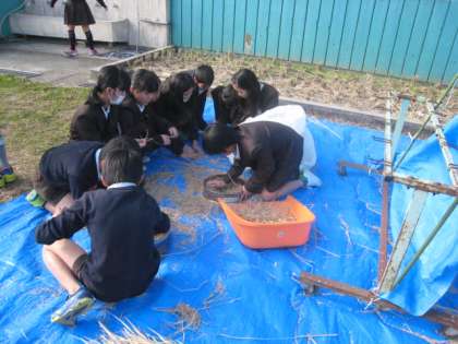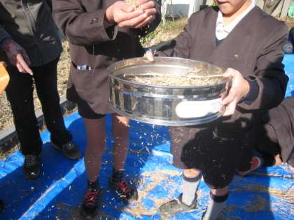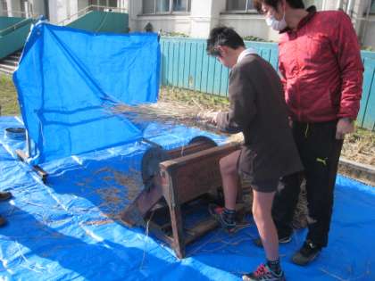 6月に田植えをした稲の刈り取りを終え、ようやく脱穀ができました。足踏み脱穀機を地域の方に持ってきていただき、脱穀をしました。脱穀は足踏み脱穀機で脱穀した後、わらと混じった米からわらを取り除かなくてはいけません。思った以上に大変作業に子どもたちはびっくりしていました。
