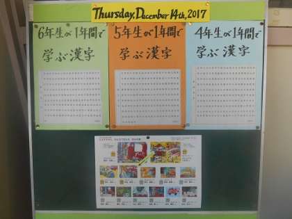 校長室前の掲示が変わりました。校長先生が今福小学校に来られてから見つけられたチョウについてまとめたものです。意外とたくさんの種類が見られることに驚きました。また、小学校で学習する漢字の一覧や、毎日の日付を英語で書きあらわしたカードが掲示されています。消防図画で優秀賞を受賞した本校児童の作品が消防署のカレンダーに掲載されていることもお知らせしています。