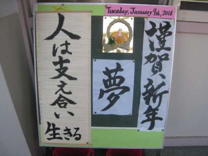 新年を迎え、校長室前の掲示も変わりました。校長先生が、よくお話される「人は支え合い生きる」を毛筆で書かれたものを掲示しています。