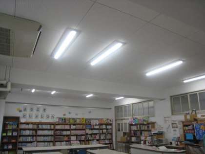これまで図書室の照明は蛍光灯でしたが、故障や不具合があり、冬休みに照明をLEDにかえる工事をしました。図書室がとても明るくなり、本が読みやすい環境になりました。