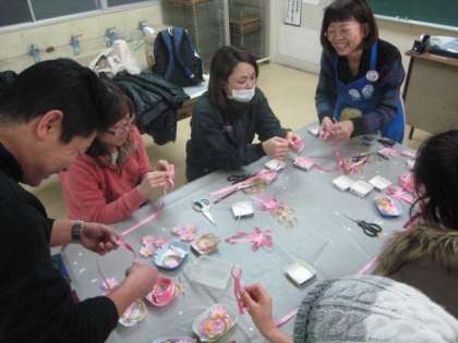 城東区内のすべての大阪市立学校園の卒業生に手づくりの胸花をプレゼントしています。1月26日に生涯学習推進委員の方や地域の方、PTAの役員の方々、学校関係者が一つずつ丁寧に胸花を作ってくださいました。地域の皆さんの思いに感謝しています。