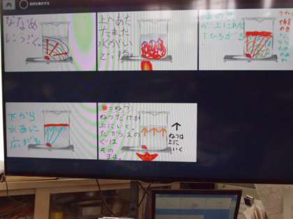 4年生の理科では「ものの温まり方」の学習でタブレット端末を使いました。実験の課題に対して予想を立て、意見を交流しました。これまでも、タブレット端末によく触れている子どもたちなので、思った以上にスムーズに学習できました。何回も触り、操作することが大切だなと改めて感じました。