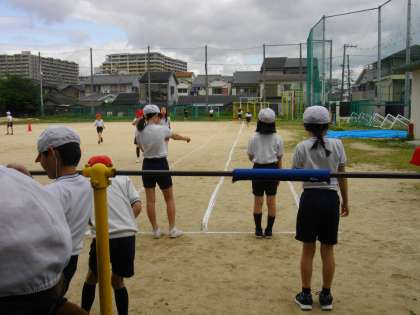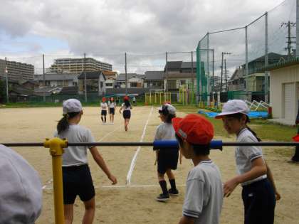 50m走。体を前に傾けて、手を思い切って振りながら、足の裏で地面を強くけりましょう。そうしたらこれまでより早く走れるよ。