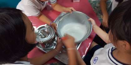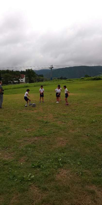 その後雨も降らず涼しく爽やかな中、すべて順調に進んでいます。アイスクリームづくりの説明を受け自分たちでつくります。