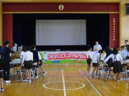 この記念すべき日に、5年生は「トヨタ原体験授業」と題して、トヨタ自動車のスタッフの方から、ゲームを取り入れた出前授業をしていただきました。各グループは協力し合い、楽しみながら自動車のことなどを学ぶことができました。