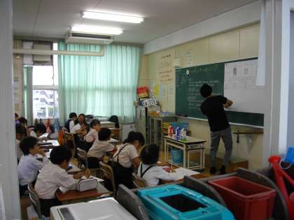 写真右は、4年生の「道徳・雨のバスていりゅう所で」の授業です。