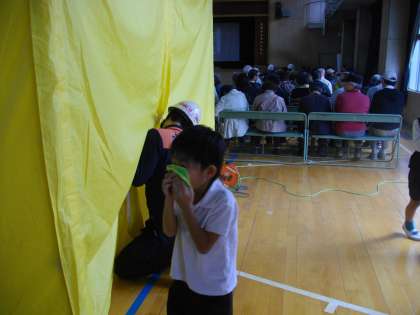 なかでも、煙体験(本当の煙ではないので害はありません)は、1年生から6年生までの児童全員とほとんどの地域の方が体験し、皆さんがめったにできない体験ができたのがよかったと思います。私もシート内に入り、目の前が全く見えない状態を体験しました。